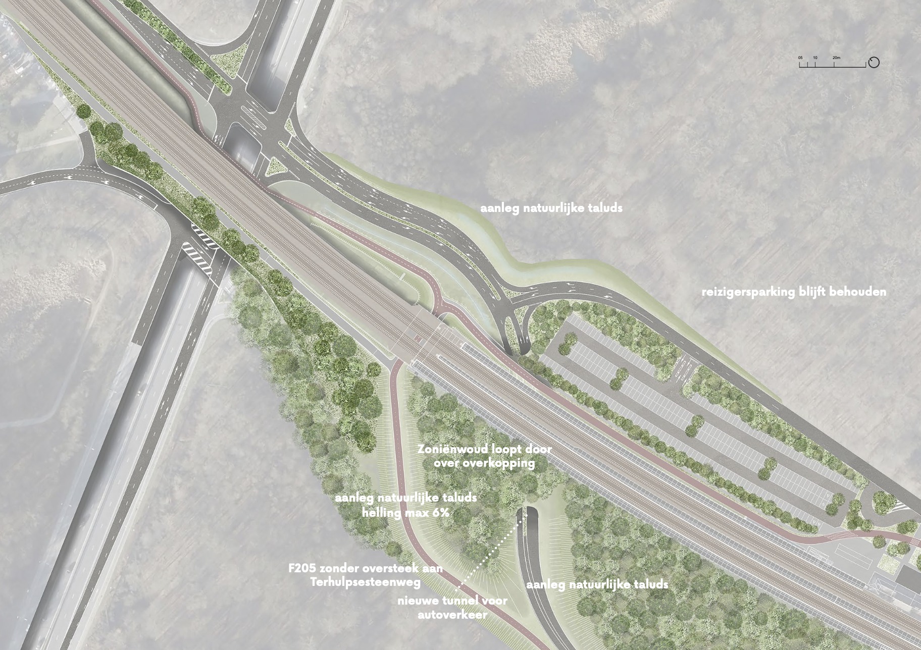 L’objectif est de simplifier les flux, améliorer la lisibilité de l’infrastructure et renforcer la sécurité pour tous les usagers. Le projet comporte également des avancées importantes pour la mobilité active, notamment via l’amélioration de la cyclostrade, ainsi que pour la biodiversité, en permettant de reconnecter des parties de la forêt de Soignes aujourd’hui fragmentées par le ring.